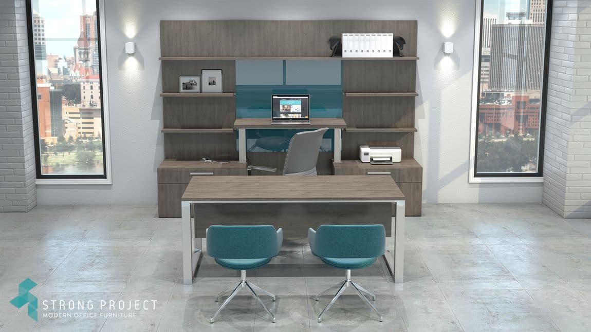 This enhanced but affordable executive office suite design includes an array of integrated wall unit options that comprehensively address your needs for worksurfaces, storage, height adjustability, glass markerboards and all the other elements of a high-performance work setting.