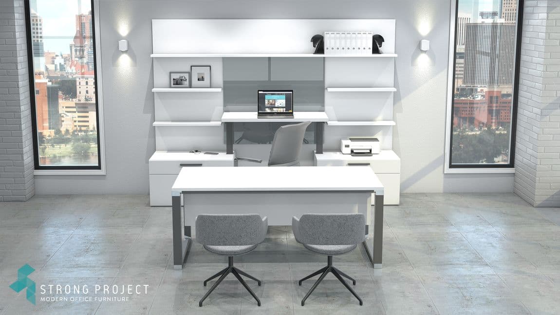 This enhanced but affordable executive office suite design includes an array of integrated wall unit options that comprehensively address your needs for worksurfaces, storage, height adjustability, glass markerboards and all the other elements of a high-performance work setting.