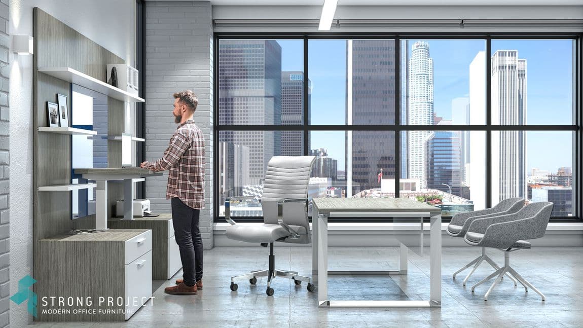 • Thoughtfully nested mechanisms for height adjustable worksurfaces ensure attractive wellness options while maintaining the main executive desk for meetings.