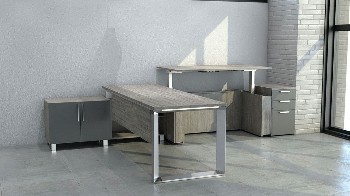 This enhanced but affordable Sit-Stand Executive Office Desk design incorporates the electronic height adjustable platform on the return side instead of the main desk and hides wires behind access doors in the base of the return.