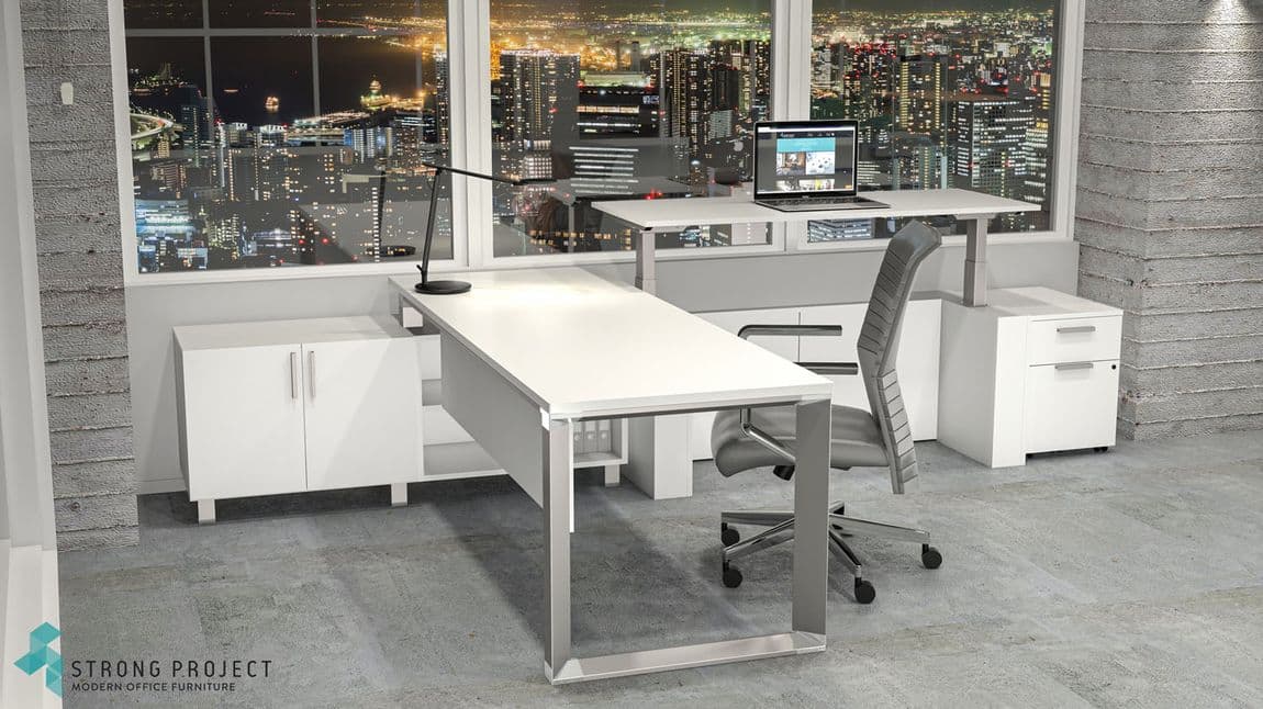 This enhanced but affordable Sit-Stand Executive Office Desk design incorporates the electronic height adjustable platform on the return side instead of the main desk and hides wires behind access doors in the base of the return.
