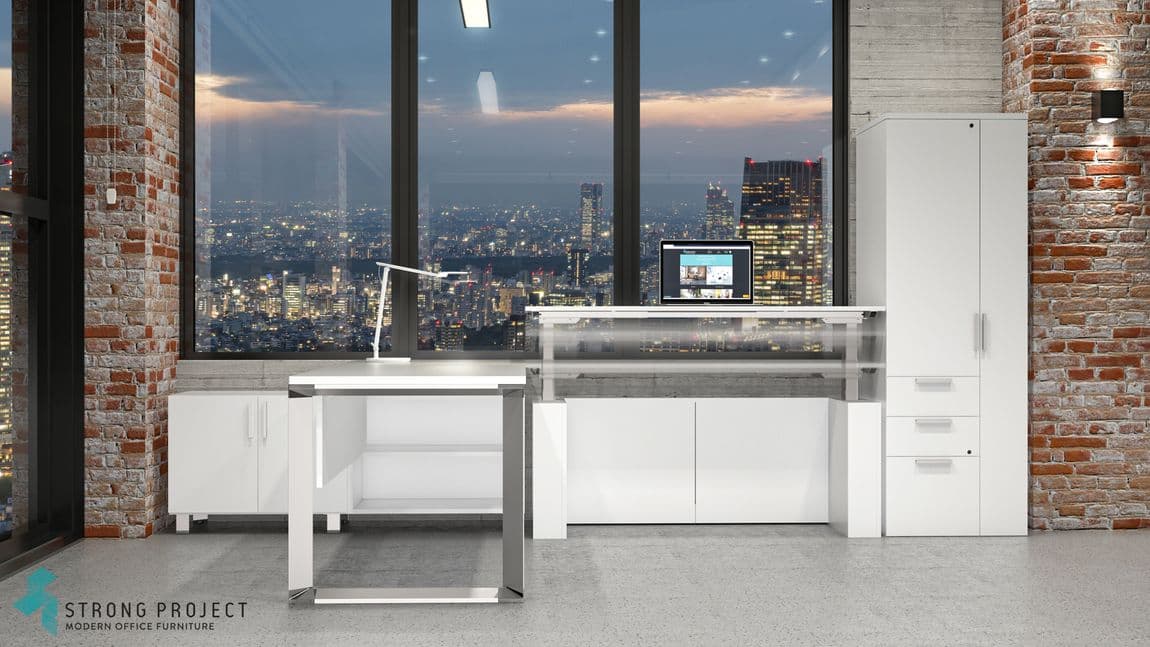 This enhanced but affordable Sit-Stand Executive Office Desk design incorporates the electronic height adjustable platform on the return side instead of the main desk and hides wires behind access doors in the base of the return.