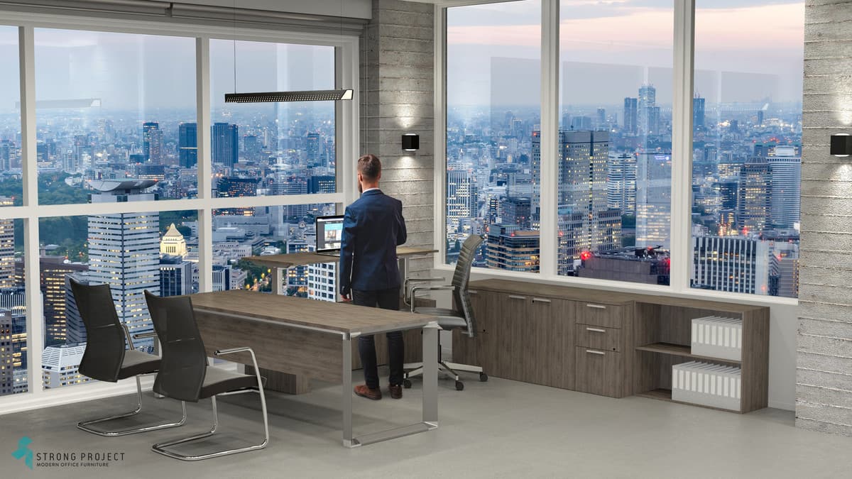 Thoughtfully nested mechanisms for height adjustable worksurfaces ensure attractive wellness options while maintaining the main executive desk for meetings.