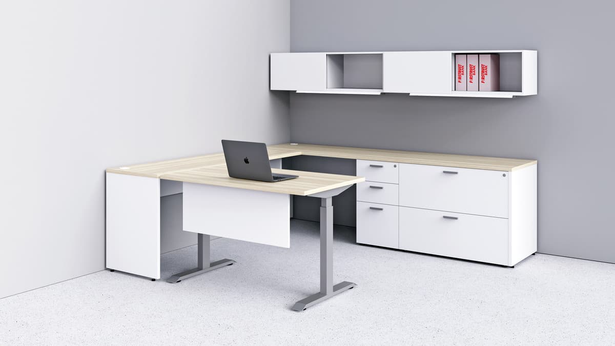 This Standing Desk and Storage series of Private Office Furniture delivers a super-smart look at an affordable price. Always conceived and created in North America, this transitional style collection includes our coveted laminate-surface collection, proprietary designs in crafted aluminum accents and unique integration of textile components.