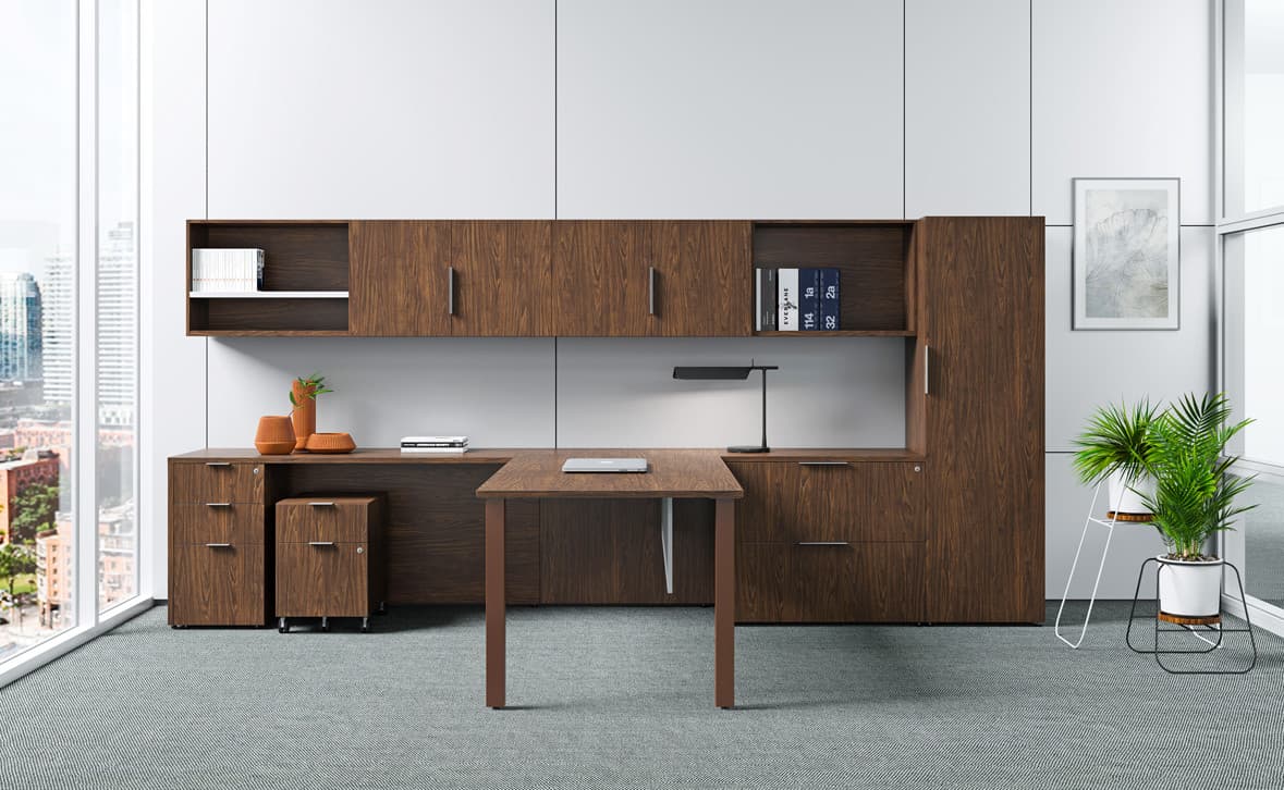 This Standing Desk and Storage series of Private Office Furniture delivers a super-smart look at an affordable price. Always conceived and created in North America, this transitional style collection includes our coveted laminate-surface collection, proprietary designs in crafted aluminum accents and unique integration of textile components.
