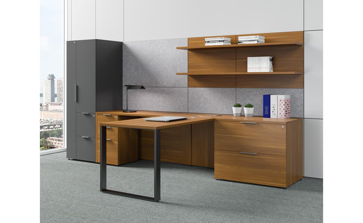This Standing Desk and Storage series of Private Office Furniture delivers a super-smart look at an affordable price. Always conceived and created in North America, this transitional style collection includes our coveted laminate-surface collection, proprietary designs in crafted aluminum accents and unique integration of textile components.