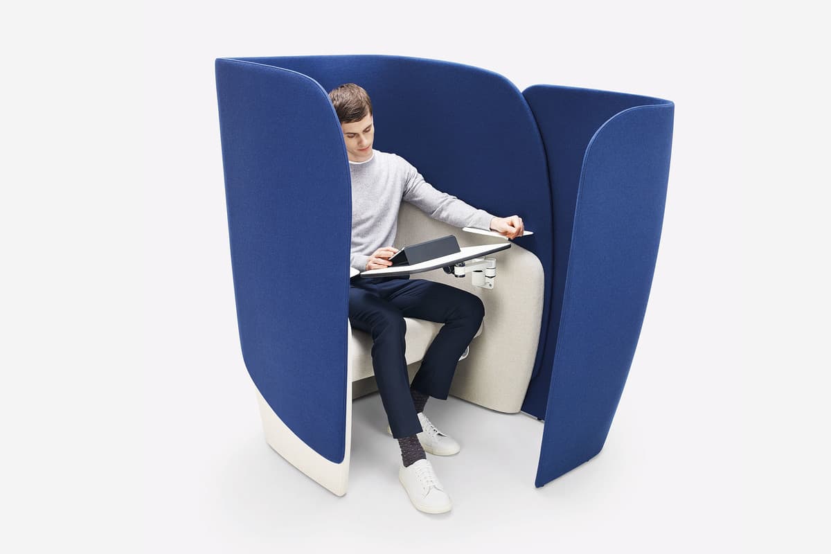 This social distancing furniture solution is a personal workspace with an acoustic privacy screen and multi-positional writing tablet for quiet and private working. Arm shelves and power options provide additional work surfaces and connectivity. Dual density foams support the user and there is storage underneath the seat area. An upholstered return screen can be added to the front of the unit to further enhance user privacy.