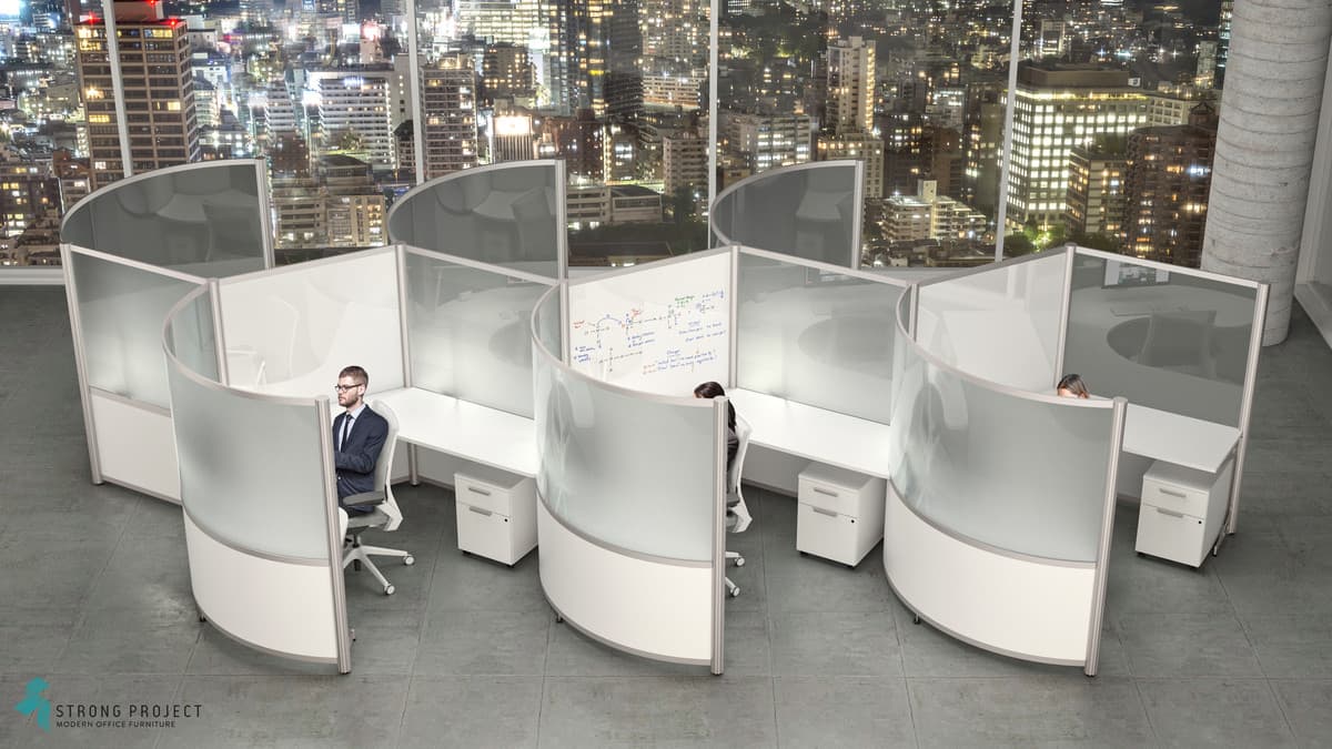 Curved Workstations with Privacy Screens for Social Distancing with Modern Style! This curved workstation “privacy design” is 66”H, so that there is sufficient shielding if someone were to cough or sneeze at their desk. The workstation components are made of easily cleanable materials such as laminate, acrylic and marker board. Shown in a 66”H x 96” Diameter workstation footprint. We have the ability to customize Heights for more or less privacy.