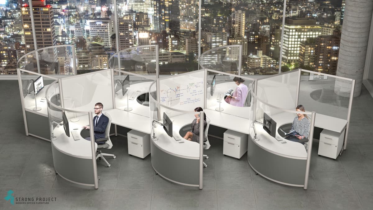 Curved Workstations with Privacy Screens for Social Distancing with Modern Style! This curved workstation “privacy design” is 66”H, so that there is sufficient shielding if someone were to cough or sneeze at their desk. The workstation components are made of easily cleanable materials such as laminate, acrylic and marker board. Shown in a 66”H x 96” Diameter workstation footprint. We have the ability to customize Heights for more or less privacy.