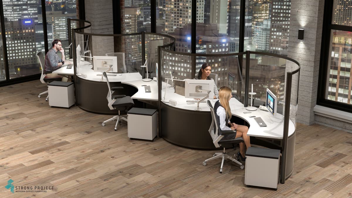 This curved workstation “privacy design” is 66”H, so that there is sufficient shielding if someone were to cough or sneeze at their desk. The workstation components are made of easily cleanable materials such as laminate, acrylic and marker board. Shown in a 66”H x 60”W Worksurfaces.