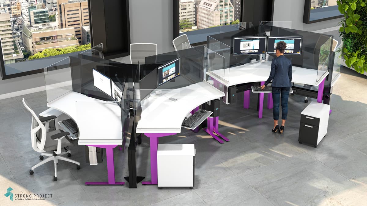 • 24”H Desktop-mounted acrylic screens travel with the height-adjustable desktop providing constant shielding if someone were to cough or sneeze at their desk.