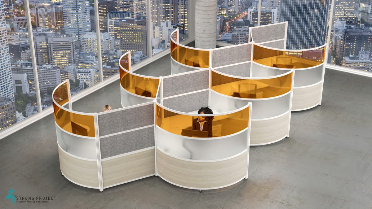 Curved Workstations with Privacy Screens for Social Distancing with Modern Style! This curved workstation “privacy design” is 66”H, so that there is sufficient shielding if someone were to cough or sneeze at their desk. The workstation components are made of easily cleanable materials such as laminate, acrylic and marker board. Shown in a 66”H x 96” Diameter workstation footprint. We have the ability to customize Heights for more or less privacy.
