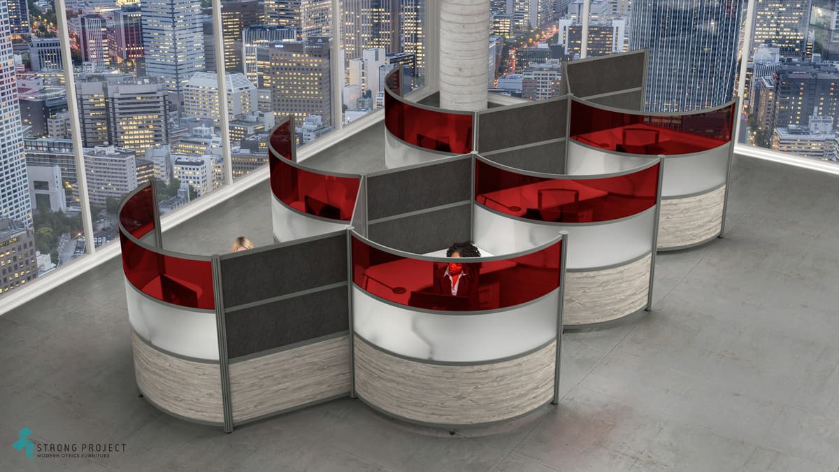 Curved Workstations with Privacy Screens for Social Distancing with Modern Style! This curved workstation “privacy design” is 66”H, so that there is sufficient shielding if someone were to cough or sneeze at their desk. The workstation components are made of easily cleanable materials such as laminate, acrylic and marker board. Shown in a 66”H x 96” Diameter workstation footprint. We have the ability to customize Heights for more or less privacy.