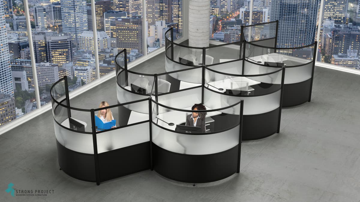 Curved Workstations with Privacy Screens for Social Distancing with Modern Style! This curved workstation “privacy design” is 66”H, so that there is sufficient shielding if someone were to cough or sneeze at their desk. The workstation components are made of easily cleanable materials such as laminate, acrylic and marker board. Shown in a 66”H x 96” Diameter workstation footprint. We have the ability to customize Heights for more or less privacy.