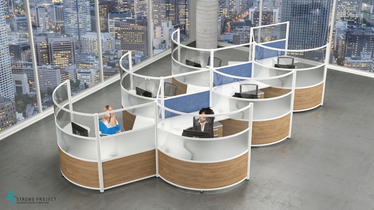 Curved Workstations with Privacy Screens for Social Distancing with Modern Style! This curved workstation “privacy design” is 66”H, so that there is sufficient shielding if someone were to cough or sneeze at their desk. The workstation components are made of easily cleanable materials such as laminate, acrylic and marker board. Shown in a 66”H x 96” Diameter workstation footprint. We have the ability to customize Heights for more or less privacy.