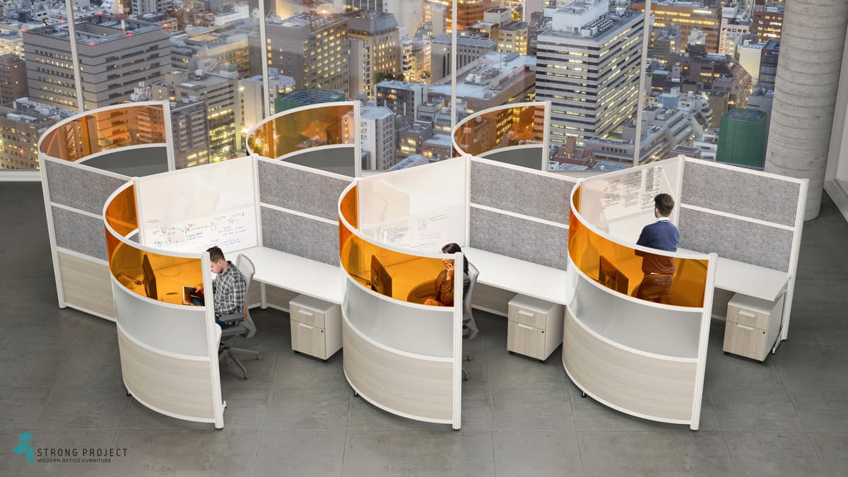 Curved Workstations with Privacy Screens for Social Distancing with Modern Style! This curved workstation “privacy design” is 66”H, so that there is sufficient shielding if someone were to cough or sneeze at their desk. The workstation components are made of easily cleanable materials such as laminate, acrylic and marker board. Shown in a 66”H x 96” Diameter workstation footprint. We have the ability to customize Heights for more or less privacy.