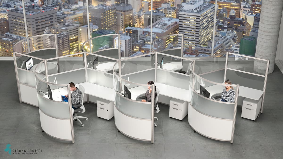 Curved Workstations with Privacy Screens for Social Distancing with Modern Style! This curved workstation “privacy design” is 66”H, so that there is sufficient shielding if someone were to cough or sneeze at their desk. The workstation components are made of easily cleanable materials such as laminate, acrylic and marker board. Shown in a 66”H x 96” Diameter workstation footprint. We have the ability to customize Heights for more or less privacy.