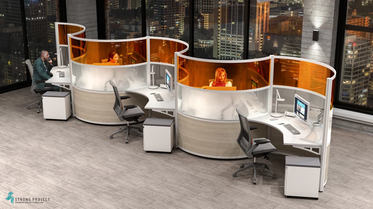 This curved workstation “privacy design” is 66”H, so that there is sufficient shielding if someone were to cough or sneeze at their desk. The workstation components are made of easily cleanable materials such as laminate, acrylic and marker board. Shown in a 66”H x 60”W Worksurfaces.