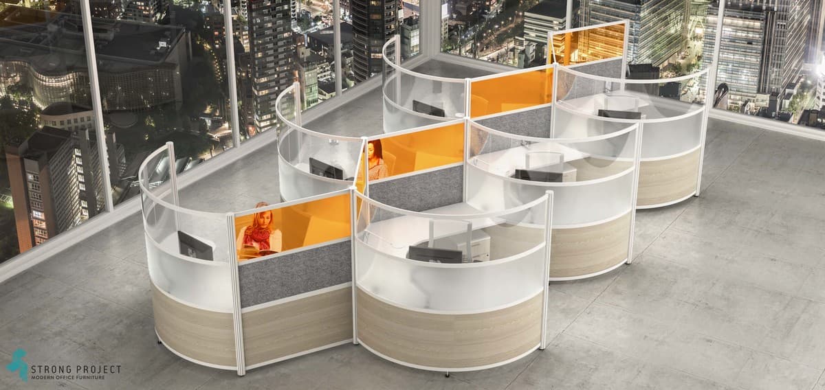 Curved Workstations with Privacy Screens for Social Distancing with Modern Style! This curved workstation “privacy design” is 66”H, so that there is sufficient shielding if someone were to cough or sneeze at their desk. The workstation components are made of easily cleanable materials such as laminate, acrylic and marker board. Shown in a 66”H x 96” Diameter workstation footprint. We have the ability to customize Heights for more or less privacy.