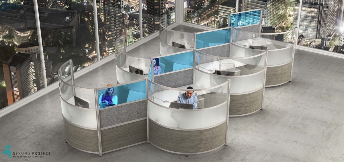 Curved Workstations with Privacy Screens for Social Distancing with Modern Style! This curved workstation “privacy design” is 66”H, so that there is sufficient shielding if someone were to cough or sneeze at their desk. The workstation components are made of easily cleanable materials such as laminate, acrylic and marker board. Shown in a 66”H x 96” Diameter workstation footprint. We have the ability to customize Heights for more or less privacy.
