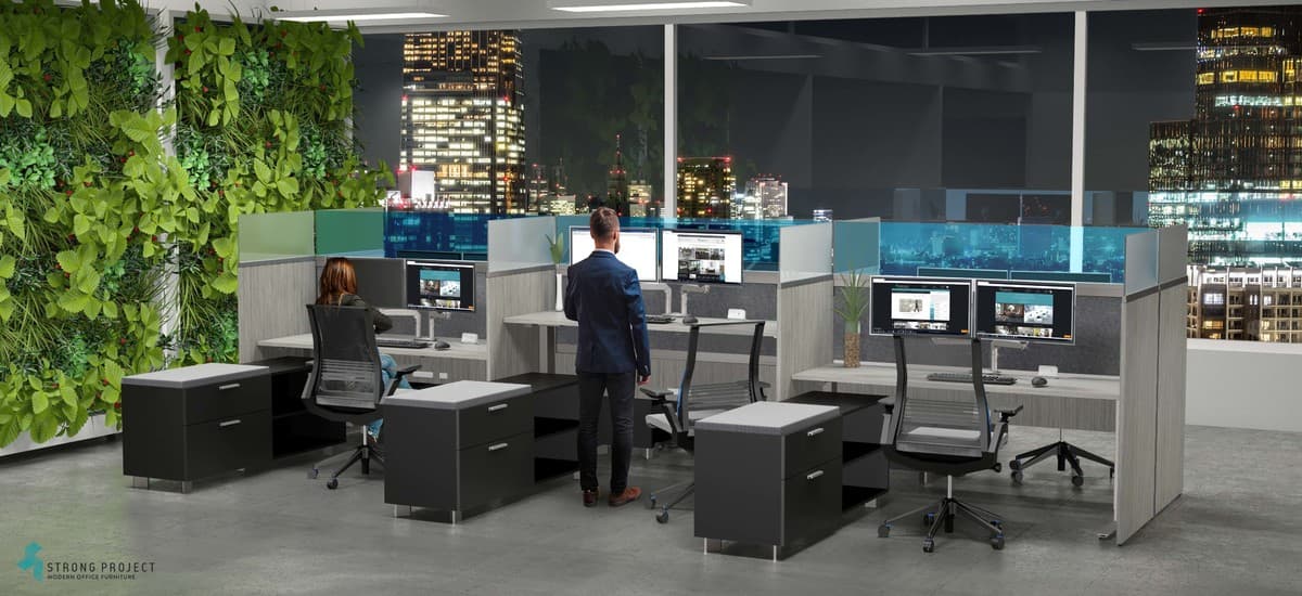 This Post-COVID open office furniture design will allow employers to create an office design that will support health and promote productivity. This Adjustable Height Workstation provides a nice blend of personal privacy & shielding while still providing an open feel letting natural light in.