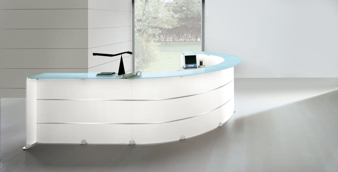 This curved reception desk collection features modular components with rounded lines and straight geometries which allows us to configure it in different ways to address your functional requirements and fit within your space.