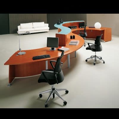 This curved reception desk collection features modular components with rounded lines and straight geometries which allows us to configure it in different ways to address your functional requirements and fit within your space.