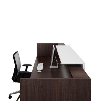 This sleek reception desk collection is modular which allows us to configure it in different ways to address your functional requirements and fit within your space.