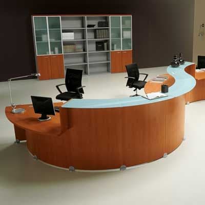 This curved reception desk collection features modular components with rounded lines and straight geometries which allows us to configure it in different ways to address your functional requirements and fit within your space.