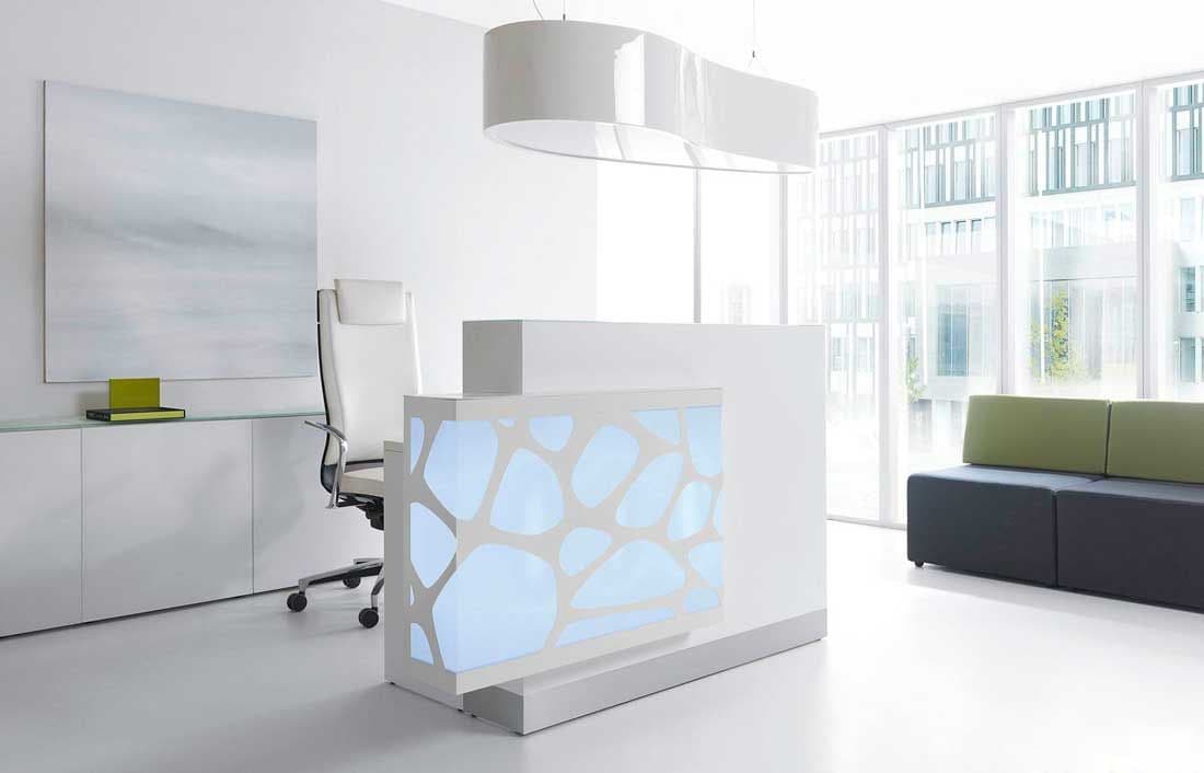 This reception desk collection allows you to program the backlighting color through the RGB spectrum to highlight your branding color or change the vibe in your lobby at will.