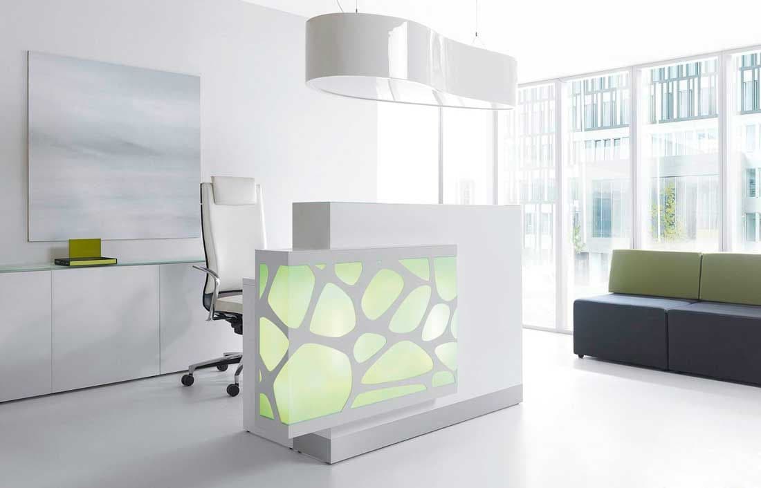 This reception desk collection allows you to program the backlighting color through the RGB spectrum to highlight your branding color or change the vibe in your lobby at will.
