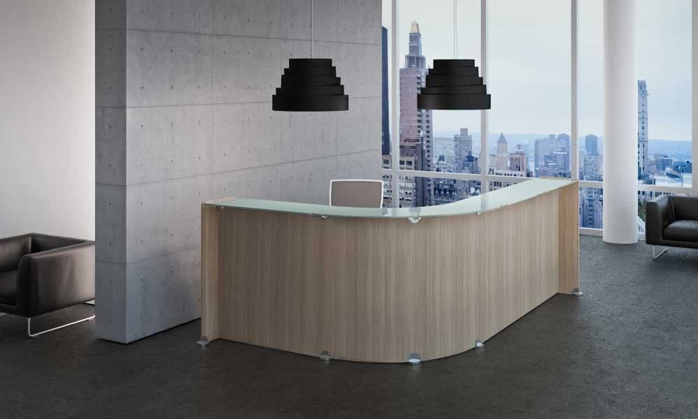 This curved reception desk collection features modular components with rounded lines and straight geometries which allows us to configure it in different ways to address your functional requirements and fit within your space.