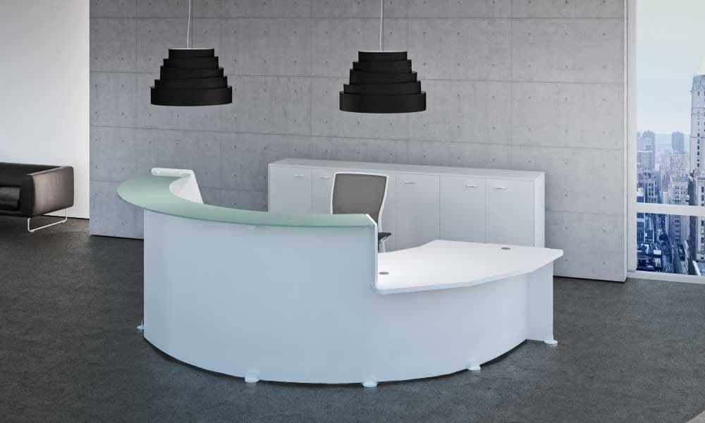 This curved reception desk collection features modular components with rounded lines and straight geometries which allows us to configure it in different ways to address your functional requirements and fit within your space.
