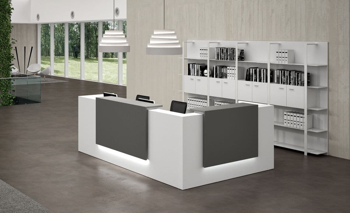 This sleek reception desk collection is modular which allows us to configure it in different ways to address your functional requirements and fit within your space.