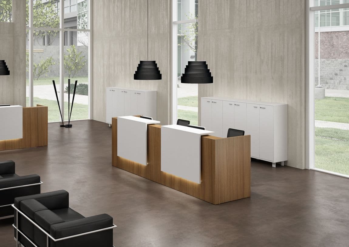 This sleek reception desk collection is modular which allows us to configure it in different ways to address your functional requirements and fit within your space.