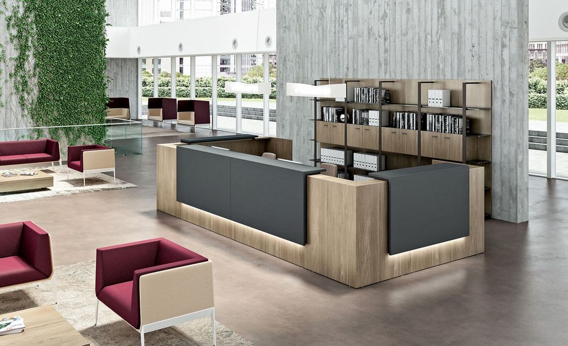 This sleek reception desk collection is modular which allows us to configure it in different ways to address your functional requirements and fit within your space.
