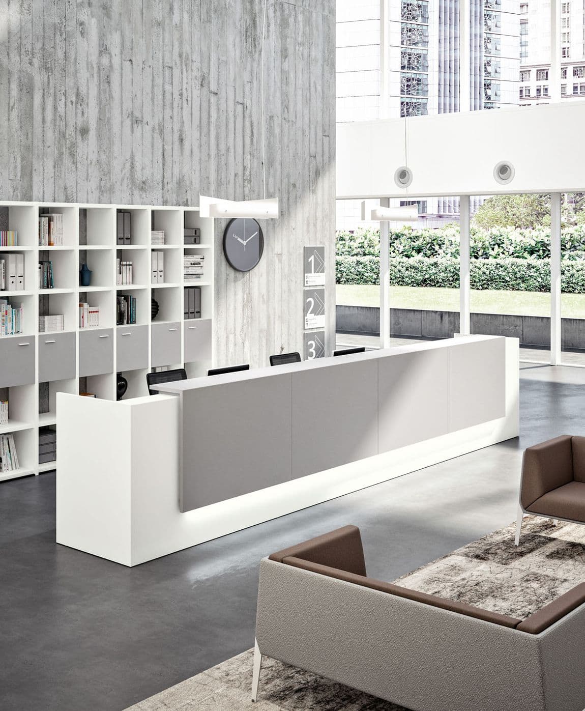 This sleek reception desk collection is modular which allows us to configure it in different ways to address your functional requirements and fit within your space.