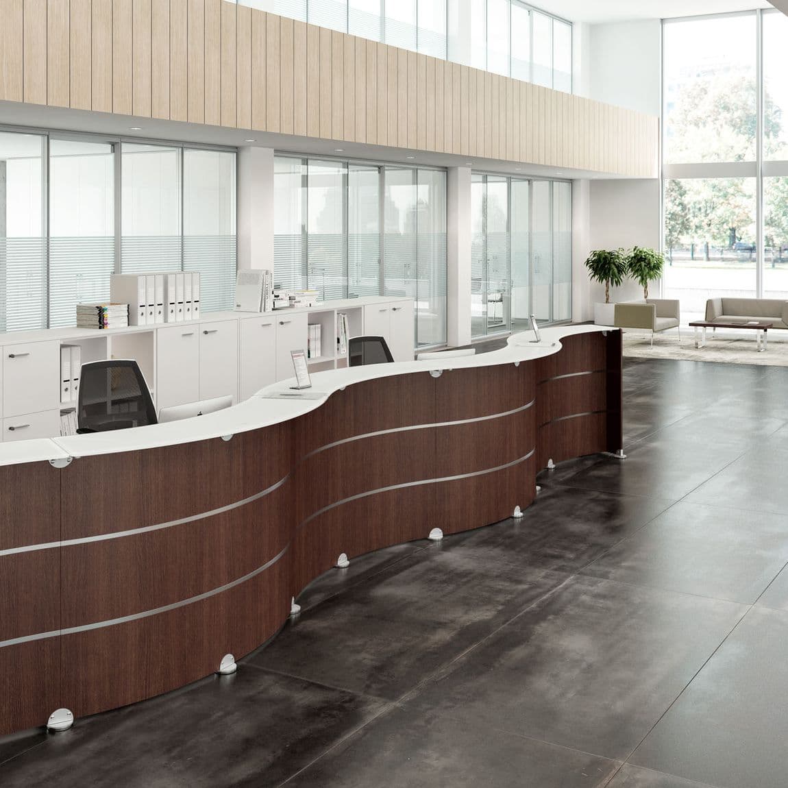 This curved reception desk collection features modular components with rounded lines and straight geometries which allows us to configure it in different ways to address your functional requirements and fit within your space.
