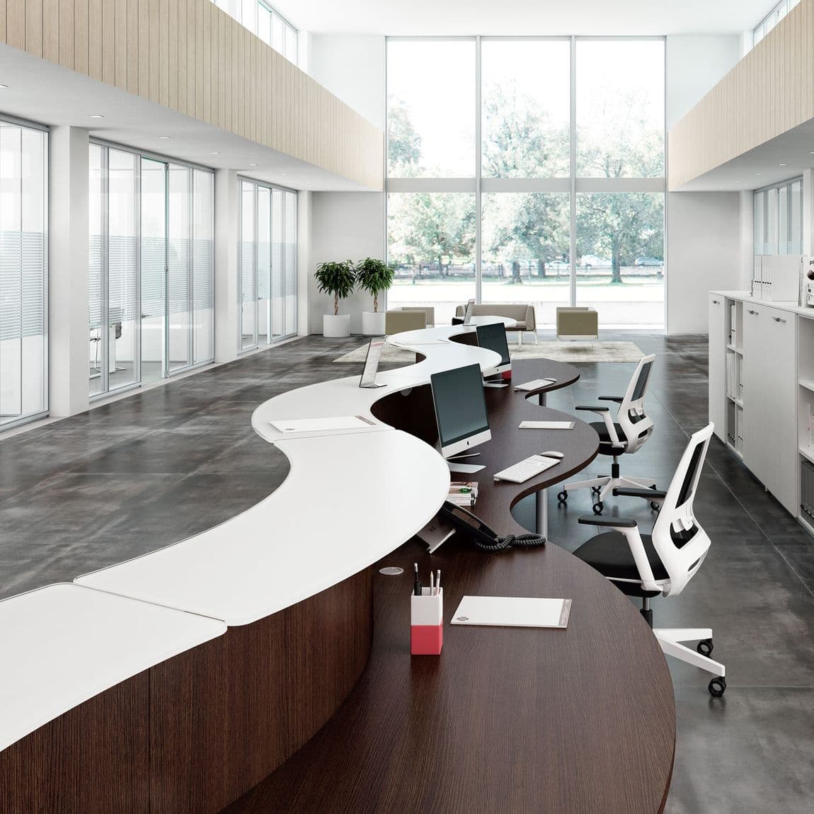 This curved reception desk collection features modular components with rounded lines and straight geometries which allows us to configure it in different ways to address your functional requirements and fit within your space.