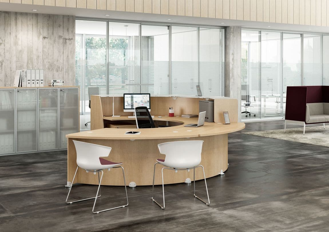 This curved reception desk collection features modular components with rounded lines and straight geometries which allows us to configure it in different ways to address your functional requirements and fit within your space.