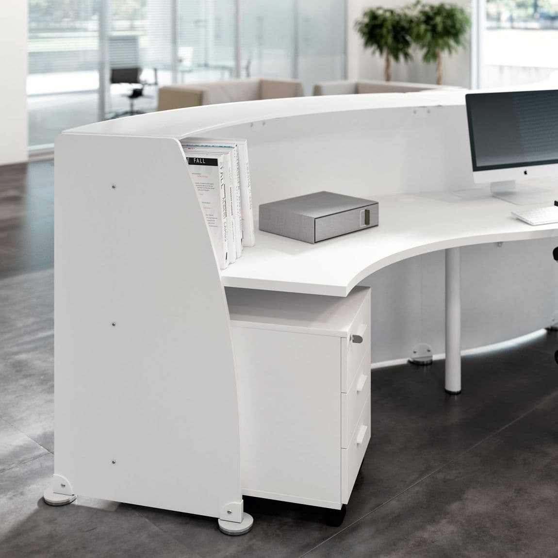 This curved reception desk collection features modular components with rounded lines and straight geometries which allows us to configure it in different ways to address your functional requirements and fit within your space.
