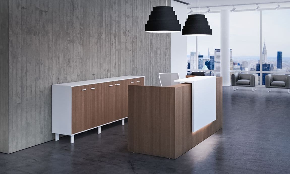 This sleek reception desk collection is modular which allows us to configure it in different ways to address your functional requirements and fit within your space.