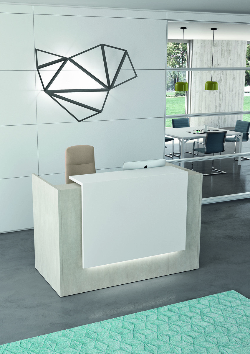 This sleek reception desk collection is modular which allows us to configure it in different ways to address your functional requirements and fit within your space.