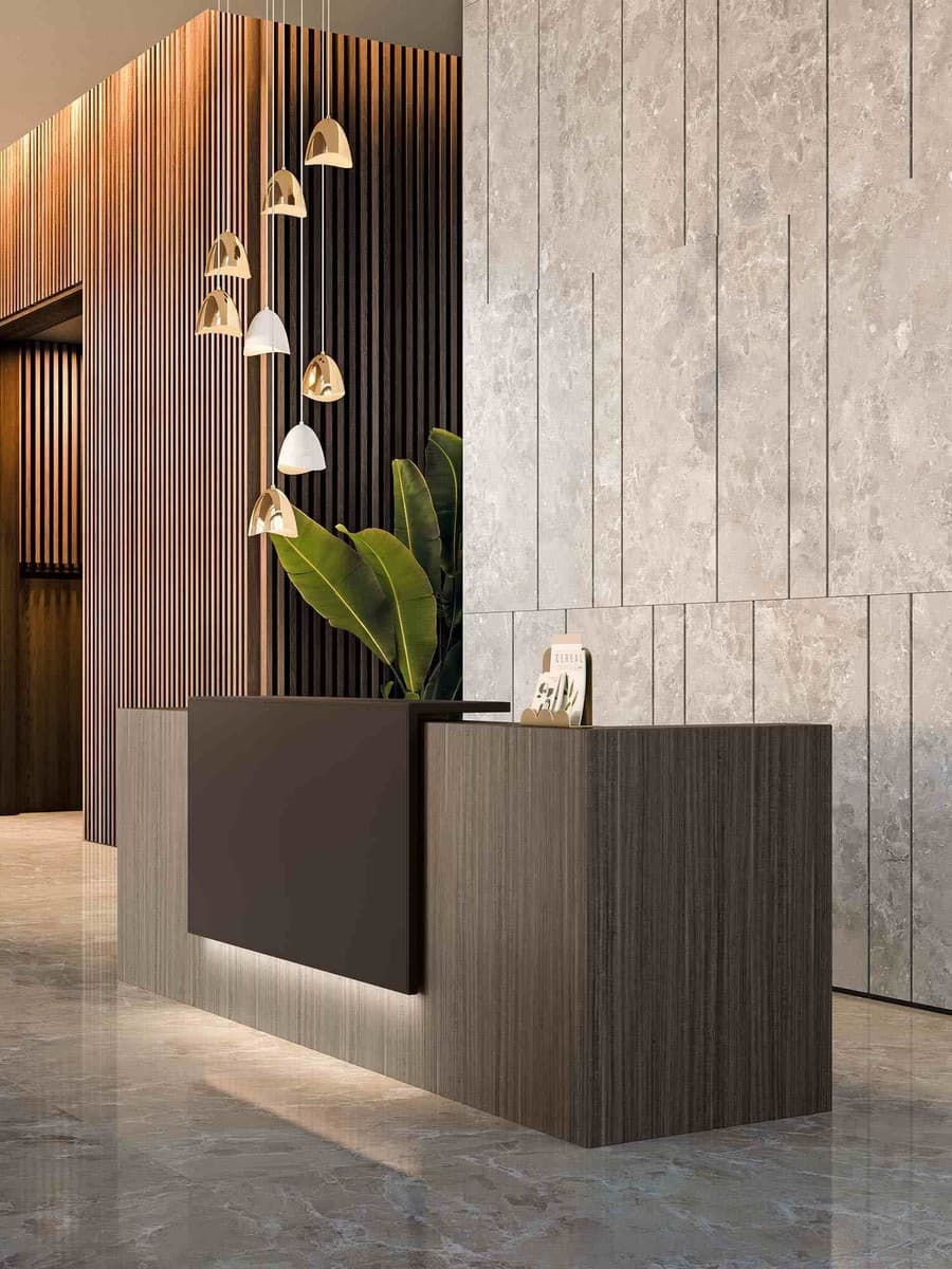 This sleek reception desk collection is modular which allows us to configure it in different ways to address your functional requirements and fit within your space.