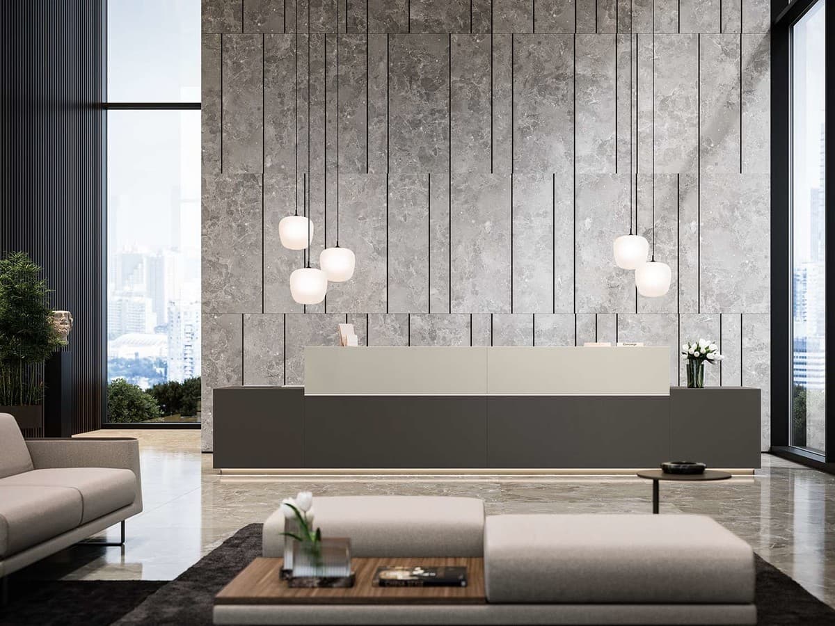 This beautiful office reception desk collection is modular which allows us to configure it in different ways to address your functional requirements and fit within your space.