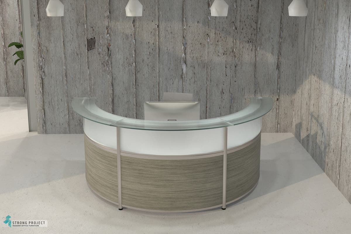 We are featuring 5 different Woodgrain finishes as well as the always popular White for this Curved Reception Desk design. If you have a specific Branding Color or woodgrain Finish that you’d like to order your Reception Desk in, select any laminate finish from Pionite, Wilsonart or Formica and we will customize the finish for you! These units come in different sizes and configurations to fit your space.