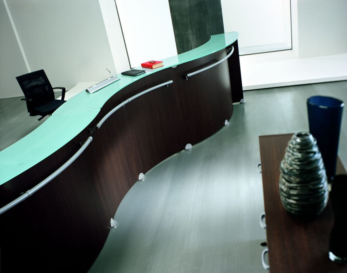 This curved reception desk collection features modular components with rounded lines and straight geometries which allows us to configure it in different ways to address your functional requirements and fit within your space.