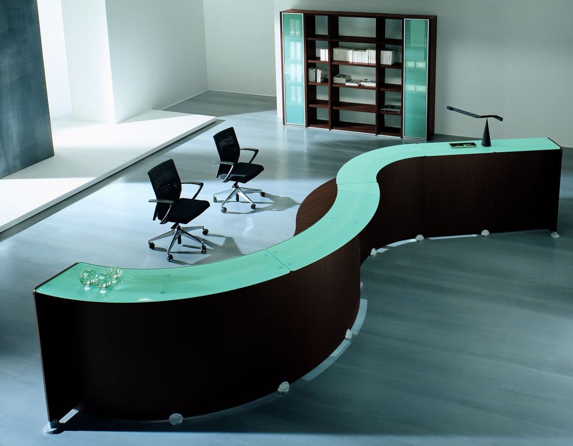 This curved reception desk collection features modular components with rounded lines and straight geometries which allows us to configure it in different ways to address your functional requirements and fit within your space.