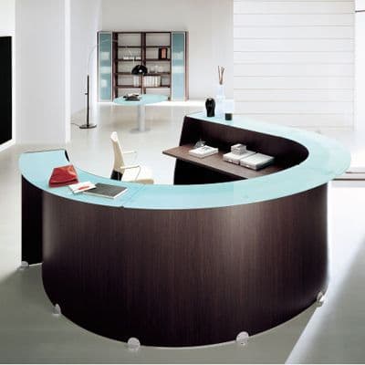 This curved reception desk collection features modular components with rounded lines and straight geometries which allows us to configure it in different ways to address your functional requirements and fit within your space.