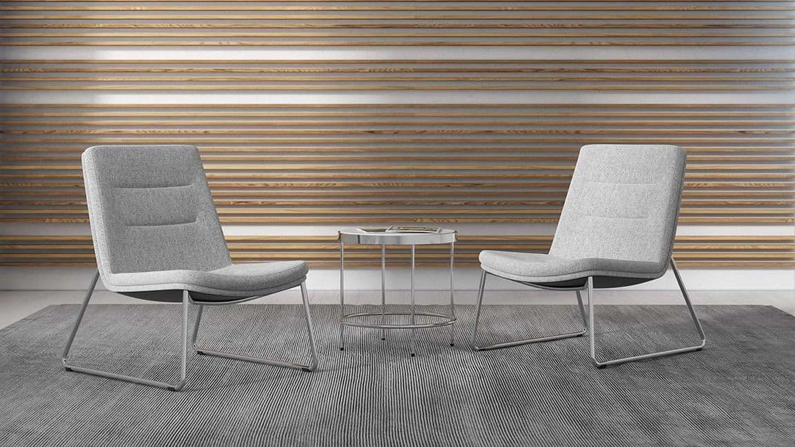 This simple, clean lounge chair series available in organic wood bases creates an inviting, relaxed aesthetic through the slender and adaptable profile, ideal for private and public areas. Transitional styling with muted design touches, such as contrasting fabrics, presents a choice to blend in or stand out in a variety of environments. Available in a wood sled base, wood rocker base, metal sled base, metal 4-prong base and 5-star caster base as well as Mid-Back and High-Back versions as well as an ottoman. Available with arms or armless. Welt trim is also available.